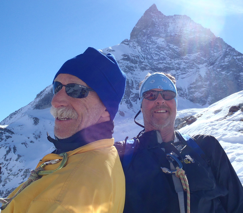 I know the word "consultant" raises flags. But that was the best word for my publishing services, because I did a wide variety of work for all kinds of clients, from the smallest businesses to five Fortune 500 companies. An aside: I've always had an irrational distaste for the word "solutions" to describe business services. But I used that word on my publishing services business card because it was the best word available. ~-~-~-~-~-~-~-~-~-~-~-~ Assorted Things For seven years in my spare time I played bass guitar at about two hundred paid gigs in and around Boston. For eighteen years my favorite hobby was mountaineering: rock climbing, snow and ice climbing, and ski mountaineering. These days my excellent climbing partner Scott and myself are too decrepit for any serious hijinks. But we sure have some memories, and if we didn't have each other to confirm that we really did what we did, we wouldn't believe we'd done it. Here we are in 2011 on the final day of the Haute Route ski tour, on our way down the long descent to Zermatt...